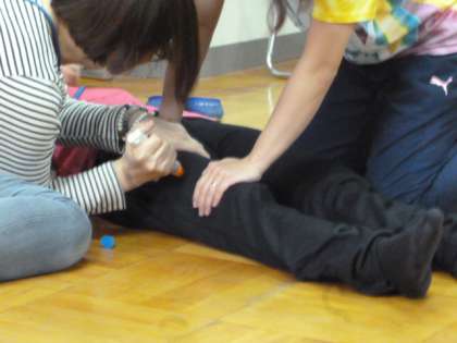 「使うタイミング」や「使い方」、「打つ場所」などを確認した後、体を抑える係、記録を取る係などに分かれて、練習用キットを使って、練習をしました。