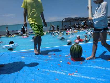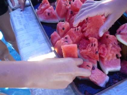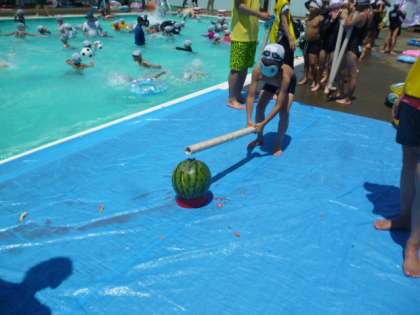 「すいかわり」をしました。割ったすいかは、みんなで食べました。