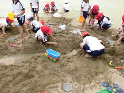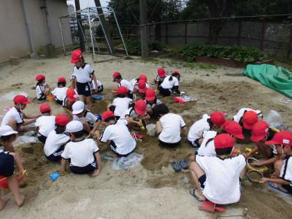 まず、砂場で山を作ったり、穴を掘ったり、川を作って水を流したりしてあそびました。