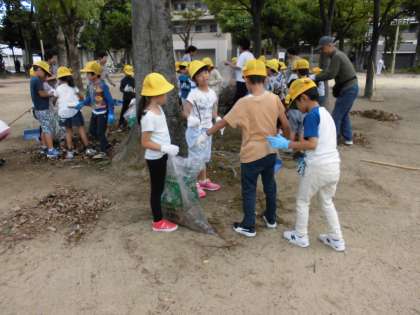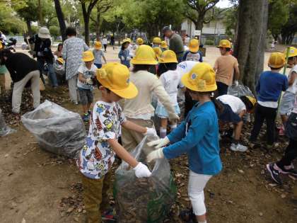 地域の方々と協力し、たくさんの葉っぱを集めていました。
