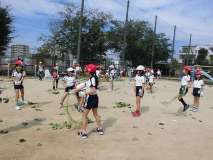 いもほりが終わった後、つるを使って、なわとびや、つなひきをしたりして遊びました。
