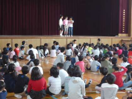 集会委員が同時に一語ずつ言い、合わせるとどんな言葉になるかを当てるゲームをしました。少し難しかったようで、5年生を中心にいろいろな答えを考えていました。