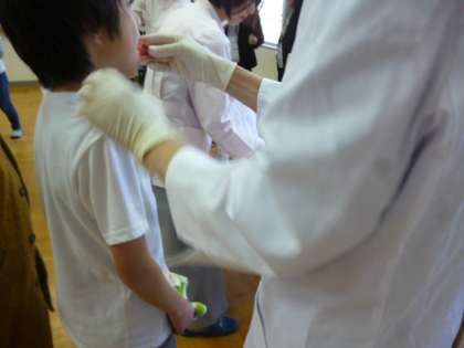 はじめに、教室で歯科衛生士さんに、はみがき指導やフッ化物塗布についてのお話がありました。みんな一生懸命に歯を磨いていました。