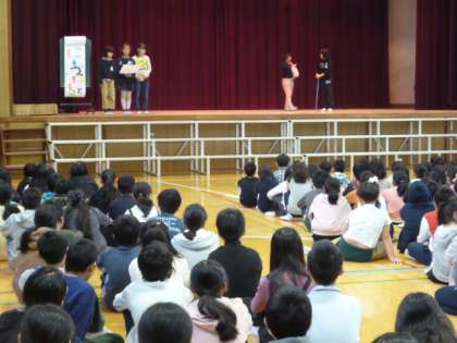 その後、3年生が総合の学習で学んだことを全校児童に紹介しました。