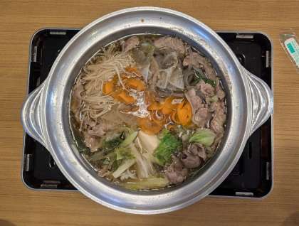 2日目晩御飯は鴨鍋です。食堂が出汁のいい匂いでいっぱいです。