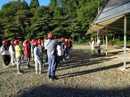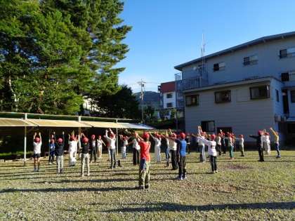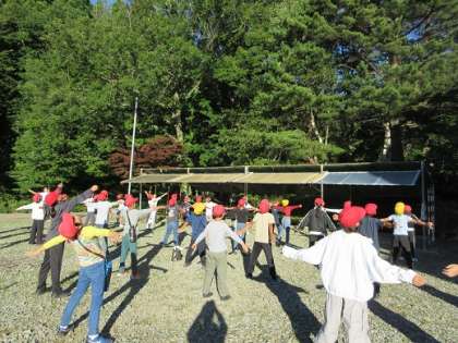昨夜は結構遅くまで起きていた子もいたようですが、青空の下で、大阪弁が楽しいラジオ体操をして、体を目覚めさせました。