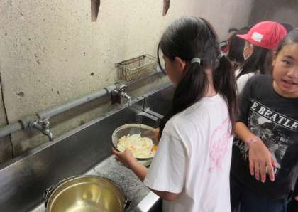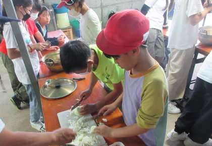山から帰って、ガリガリ君を食べて、ほてった体を冷やして、さあ、お昼のカレー作りです。グループで手分けをして野菜を切ります。危なっかしい手つきの人もいますが、慎重にていねいに材料を準備しました。