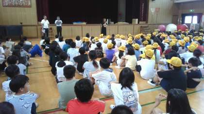 放送の合図と近くにいる先生の指示に従って、講堂へと避難します。