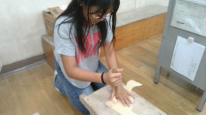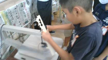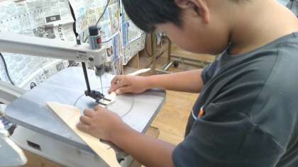 電動糸ノコギリで、板をいろいろな形に切って、組み合わせていきます。