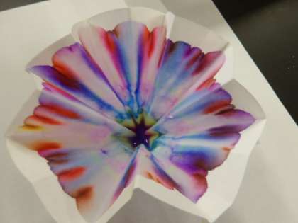 ろ紙が水を吸い上げるにつれて、どんどん色彩の帯が縁に向かって広がっていくさまは、美しいの一言。