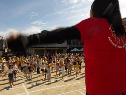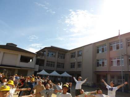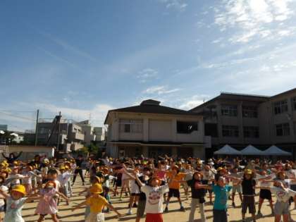 運動会に向けて、少し涼しくなった今日から外での児童朝会。