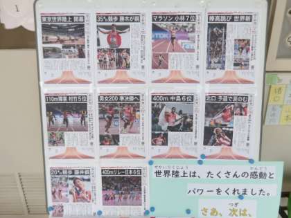 校長室の前には、校長先生セレクトのアスリートたちの活躍の軌跡をたどる新聞記事が飾られています。