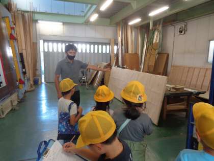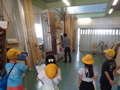 木板と鉄板をプレスする機械から出る大きな音に、子どもたちはびっくり。