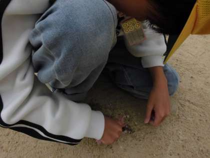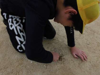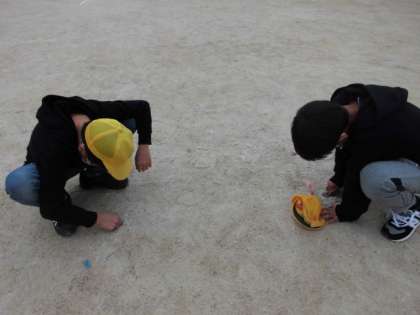 運動場に埋まったくぎを抜いています。
