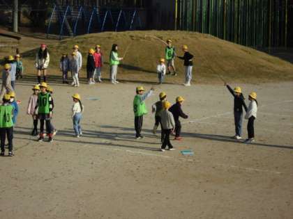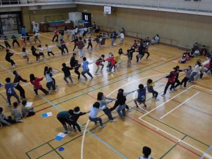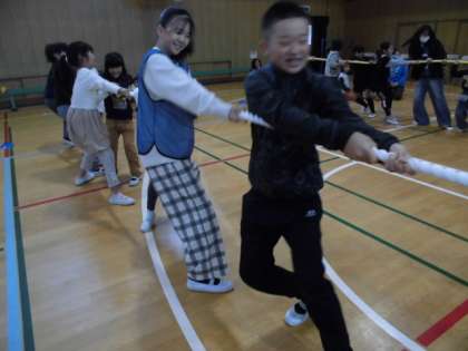 今日の児童集会はみなみん班が半数ずつ分かれて、中では綱引き、外では大縄。