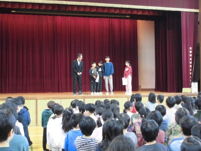 表彰のあと、美化委員会からの連絡、校長先生からは黄帽子のお話などがありました。