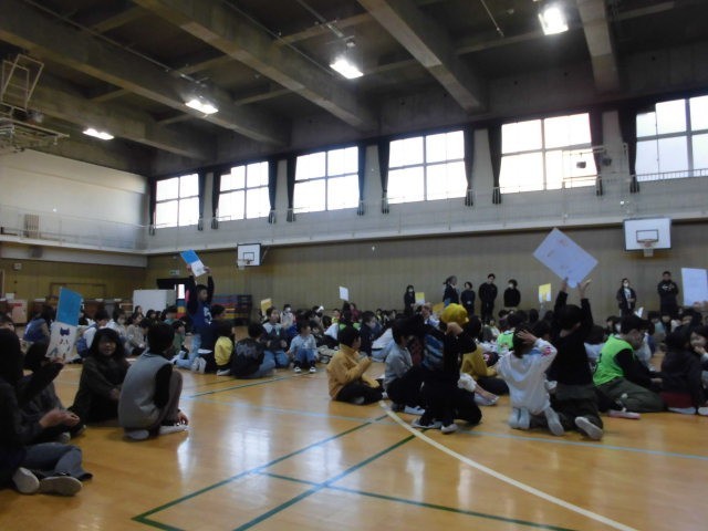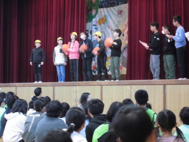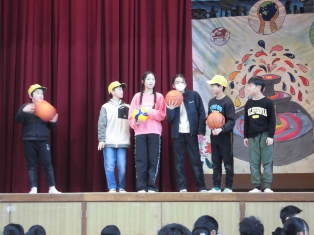 今日の児童集会は、幕の向こうで何かが起こる、です。