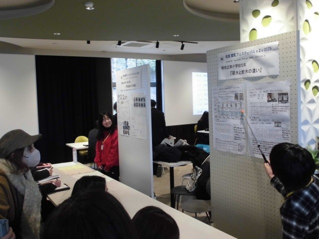 高校生のグループ発表が行われる中、子どもたちはそれぞれに、夏休みにまとめた自由研究の内容について、パネル発表をしました。