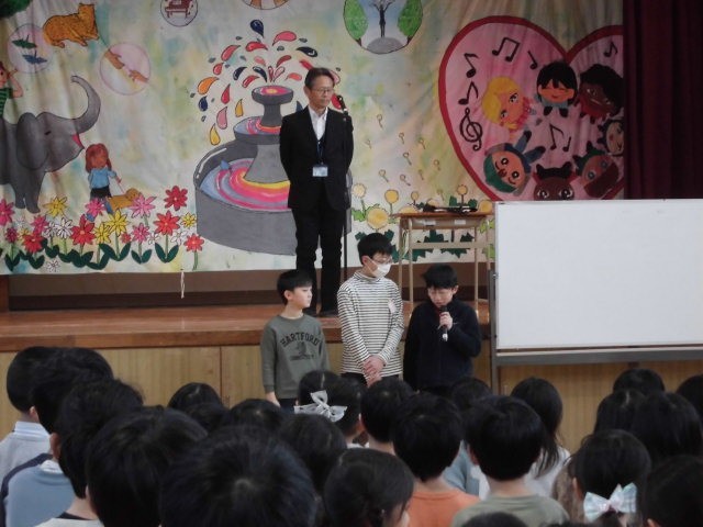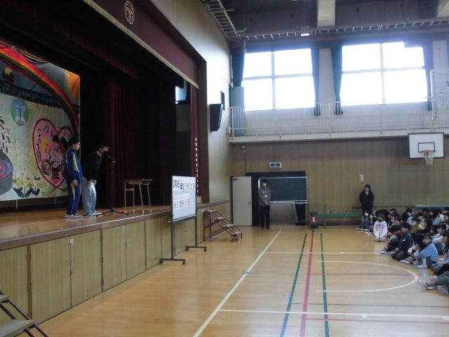給食委員会からは、食缶ぴかぴか週間に給食をしっかりと食べていた学級や給食ビンゴ達成者の発表、運動委員会からは今月下旬に行われる大なわ大会についての告知がありました。