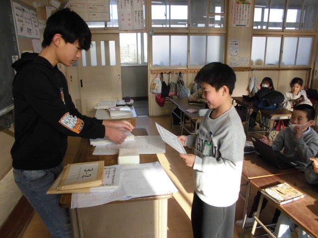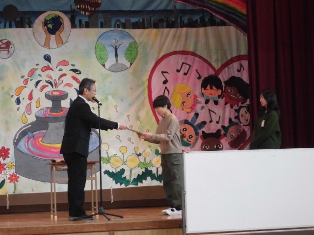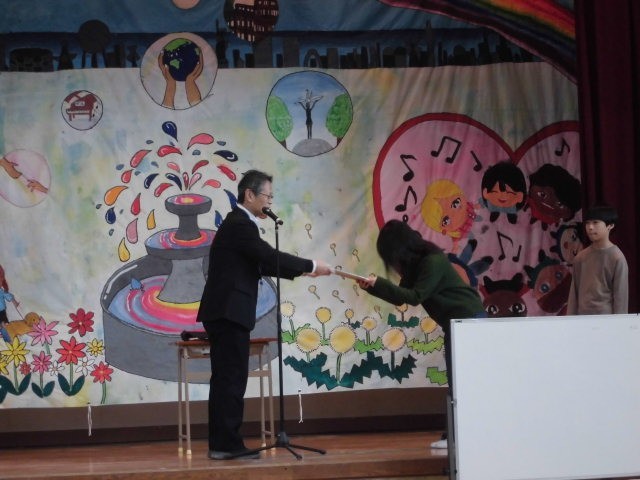児童朝会の後には、給食委員会の児童が、該当の学級に賞状を持ってやってきました。
