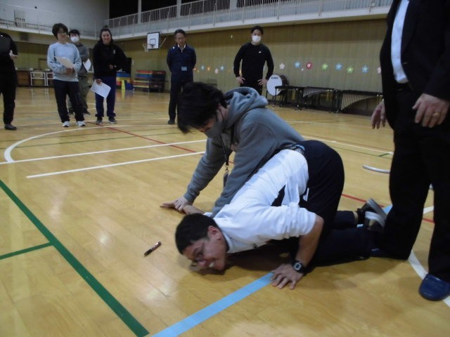 職員一人ひとりが役割分担をし、実際に不審者が侵入してくるところから、どのように連携を取りながら、その危機に対処していくか、記録映像を撮りながらの訓練を行い、警察署の方から講評をいただきました。