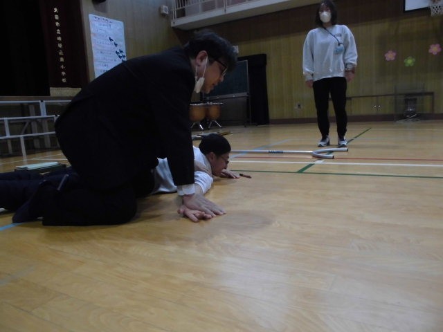 阿倍野警察署の方にお越しいただき、さすまたの使い方や不審者の取り押さえ方など、技術指導を受けました。