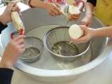 講堂での遊びが終わったら、お待ちかねの豚汁タイムです。具には、2年生が育てたサツ...