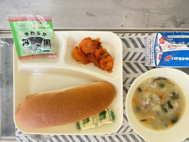 今日のこんだて黒糖パン牛乳ミートボールと野菜のカレー煮ツナとほうれんそうのソテー...