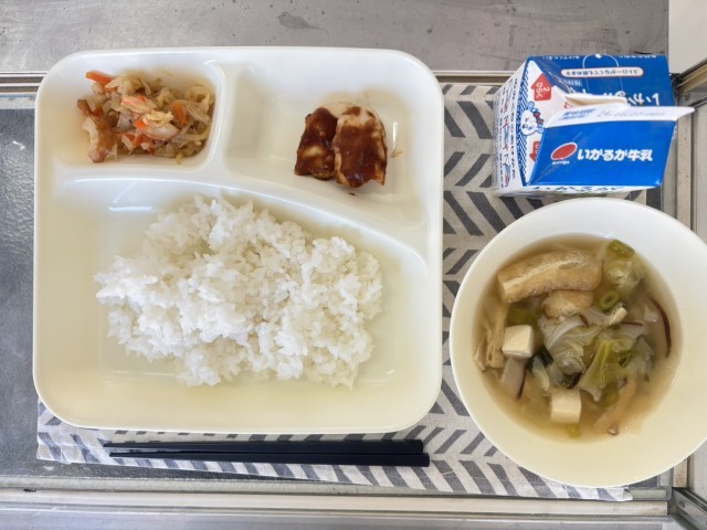 今日のこんだてごはん牛乳さごしのみぞれかけみそ汁みずなの煮びたしですクイズですQ...
