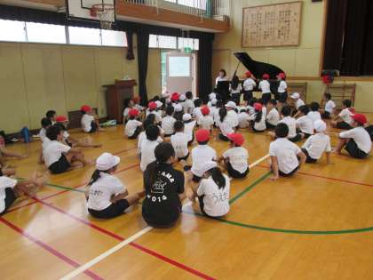 講堂のピアノの演奏に合わせて、体を動かしました。