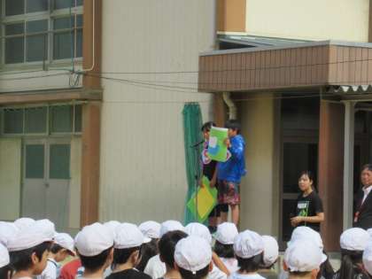 全校朝会で、清潔マンが登場し、みんなに清潔検査のことを訴えていました。