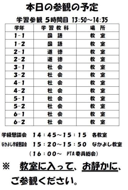 参観で学習する予定場所等をお知らせします。