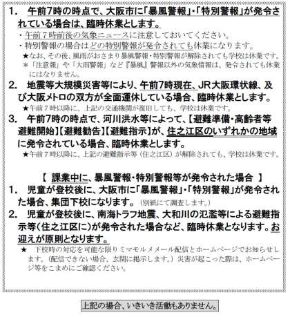 児童が登校後に、大阪市に「暴風警報」・「特別警報」が発令された場合、集団下校になります。