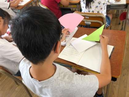 子どもたちは、図形カードを実際に操作することで、問題を解決していきました。