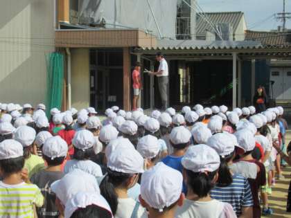 月曜日の児童朝礼では、水泳のジュニアオリンピックで3種目優勝した児童の表彰を行いました。