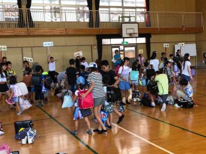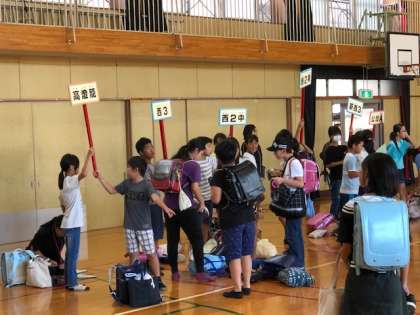 各学級で、担任が台風による災害の恐ろしさを話したり緊急避難時の諸注意をしたりしました。そして、子どもたちは緊急放送、指示をよく聞いてすばやく行動しました。