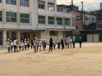放課後に運動場で音楽隊の練習をしました。 みんなでリズムを合わせるのは難しいですが、よく頑張っていました。
