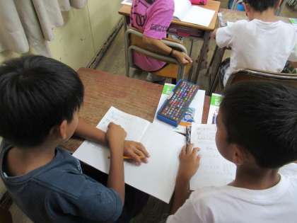 算数で、「小数のたし算」を学習しました。写真は、考え方をペアで交流しているところです。