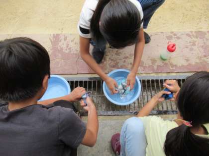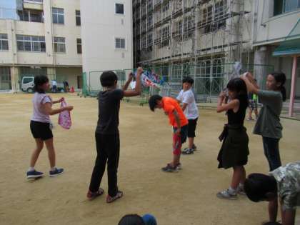6年生は、家庭科で洗濯の学習をしています。今日は、ナフキンを手洗いしました。
