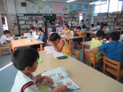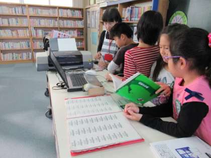 カウンターでは、図書係の子どもたちが返却や貸し出しのバーコードを読み取る作業をしていました。