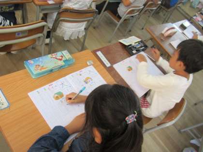 1年生では、漢字の学習をしています。手本を見ながら、一生懸命に書いていました。