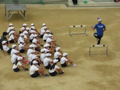 先生が、ハードルの跳び方の良い例と悪い例を示しながら、子どもたちに説明をしました。