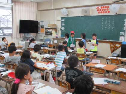 グループで音読発表会をしました。登場人物のえっちゃんや大男、きつねになって、役割読みをしました。上手に読んでいましたよ!