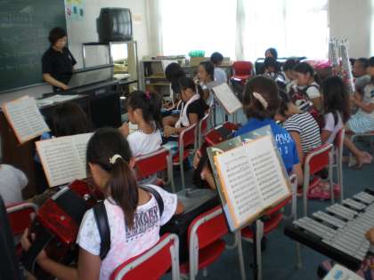 10時過ぎ…高学年の水泳指導が終わったら、プールあがりの高学年音楽隊のメンバーたちが音楽室に集まってきて、自主練習が始まります。
