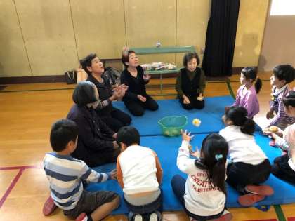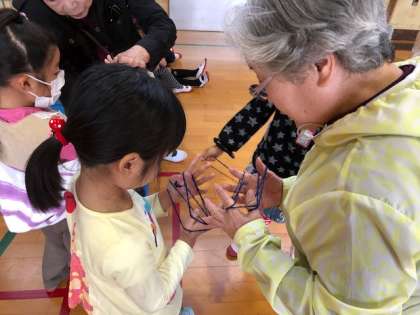 1年生は、恒例の「名人さんに学ぼう」の活動をしました。地域の方に来ていただいて、昔の遊びを教えてもらう活動です。