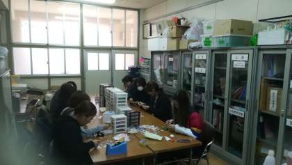 ベルマーク委員さん8名、ボランティア保護者の方1名、合計9名で、ベルマーク・インクカートリッジの整理をしました。