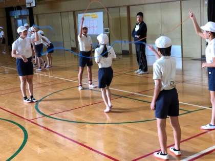 長縄を使って、タイミングを合わせて縄の中に入ったり、リズミカルに