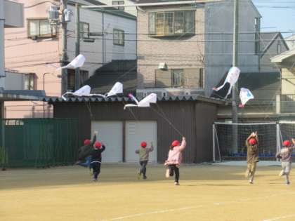 そして今日、運動場で凧揚げをしました。凧は、風にのって上手に揚がっていました。