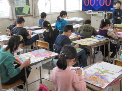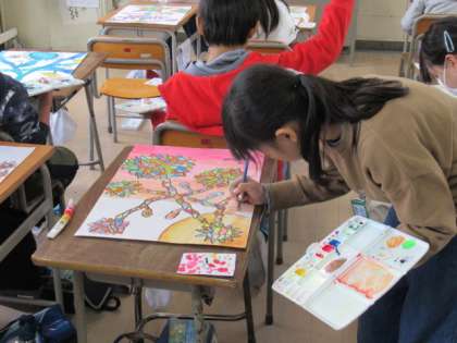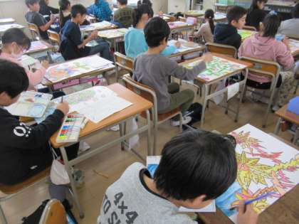 子どもたちは、花が引き立つように背景を工夫しながら彩色していきました。