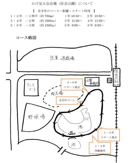 また、かけ足大会のコースになっている住吉公園は、一般の方も使用しますので、一般の方の迷惑にならないようお願いします。